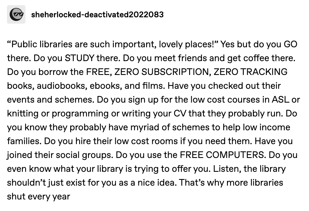 Mychal’s posts encapsulate the joy I feel at having “rediscovered” the library. Every time I find out a book I’m interested in is available at my local library, I feel like a teenager with a crush, giggling and twirling my hair and kicking my feet as I log my giddy little thoughts in a fuzzy pink diary (or, in real life, Substack). Placing a hold is like magic; actually taking a book home feels like getting away with something. You mean I can borrow this book for free, once the person before me is done with it? And I can take this free packet of seeds for my garden, too?