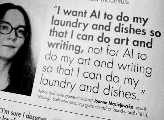 I get the sentiment behind statements like this one, I really do. Why are people so adamant about creating, advertising, and using AI programs that “write,” make music, and generate visual “art,” if that’s what humans are best at? Surely our species isn’t made to launder clothes and wash dishes until the end of time, right?